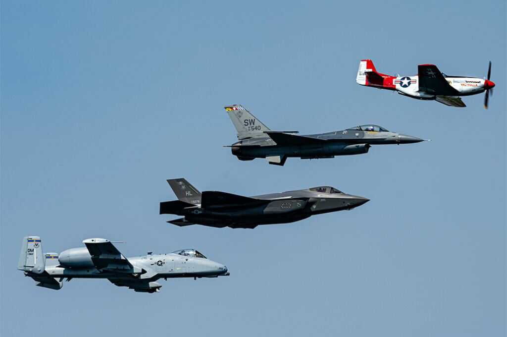 Maj. Cody Wilton, A-10 Thunderbolt II Demonstration Team commander and pilot, flies alongside Capt. Kristin Wolfe, F-35A Lightning II Demonstration Team pilot, Maj. Garret Schmitz, F-16 Viper Demonstration Team pilot, and a P-51 Mustang as part of a heritage flight formation for the Tri-City Water Follies Drive-In Airshow at Kennewick, Wash., Sept. 4, 2020. The heritage flight was flown as a showcase of past, present and future Air Force aviation. (U.S. Air Force photo by Capt. Kip Sumner)