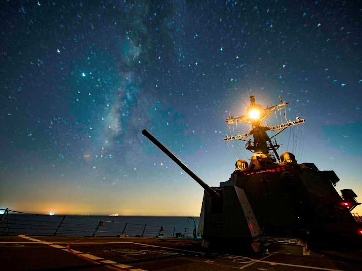 The USS Sterett steams through the night in the Gulf of Oman, Sept. 17, 2020. (Photo By: Navy Seaman Drace Wilson)