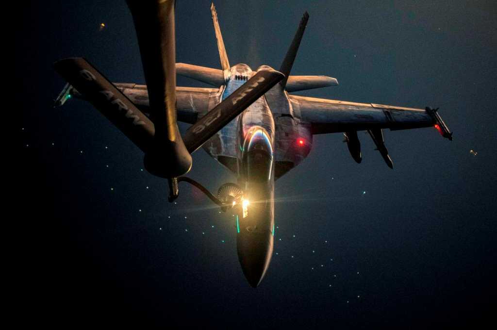 A Navy F/A-18E Super Hornet receives fuel from an Air Force KC-135 Stratotanker while flying in the U.S. Central Command area of responsibility, Sept. 22, 2020. (Photo By: Air Force Staff Sgt. Jason Allred)